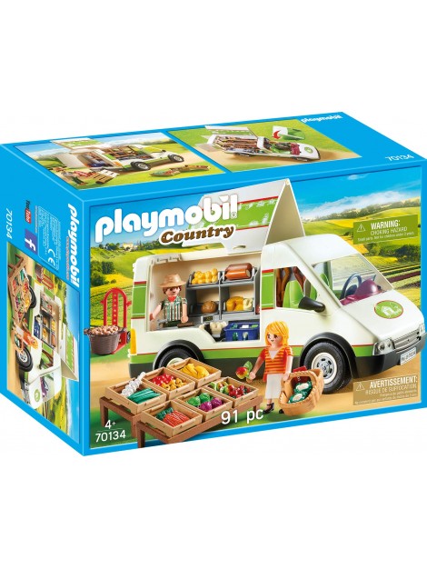 "Ogni mercoledì e sabato il contadino si reca al mercato con il suo furgone. Lì vende frutta e verdura fresca del suo orto, nonché salsicce e formaggi. Ai clienti piace comprare da lui perché è rinomato in tutta la regione per la freschezza e la qualità dei suoi prodotti. Dopo una giornata fortunata al mercato, l'agricoltore rimette le cassette di frutta e i cestini nel furgone e torna alla fattoria. Il furgone del mercato bio è dotato di mensole per pane, salsicce, formaggi e altri prodotti agricoli. Il play set include inoltre sei cassette per frutta e verdura, un cesto con patate, un carrello, una cassa con due bottiglie, due personaggi PLAYMOBIL e tanti altri accessori."