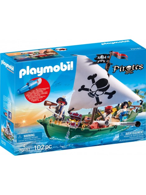 Playmobil 70151 Nave Pirata con Motore Subacqueo (Playmobil Pirates)è composto da una nave verde con con tre pirati a bordo, la vela con inciso lo spaventoso logo dei conquistatori dei mari, il cannone per proteggerli, la rete per catturare i pasti e il forziere del tesoro pieno di monete d’oro. Affronta le sfide dei mari, naviga nelle acque più tormentate e sentiti partecipe delle loro avventure. Questa nave conquisterà tutti i bambini!