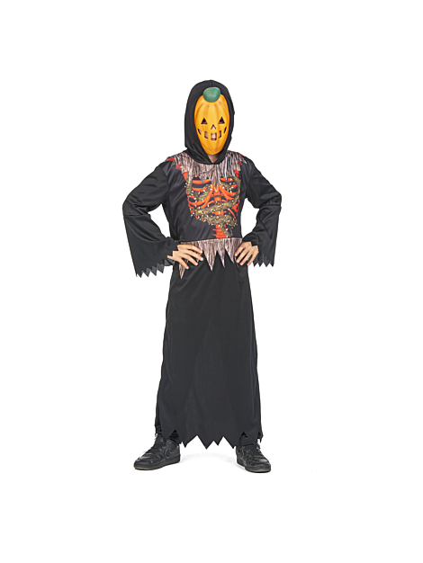 Questo costume da zucca scheletro è per bambini. Include una maschera e un vestito con cappuccio. Il vestito è nero con maniche lunghe. Le estremità sono tagliate a forma di denti. Sul busto è stampato uno scheletro arancione circondato da un ramo spinoso. Il vestito include un colletto con motivo in legno e una cintura con lo stesso motivo. Il cappuccio è nero. La maschera arancione rappresenta il volto di una zucca. I fori rappresentano i dettagli del volto. Una protuberanza verde sulla parte superiore della maschera rappresenta il gambo della zucca. Questo costume da zucca scheletro ti permetterà di avere il costume più originale per Halloween!