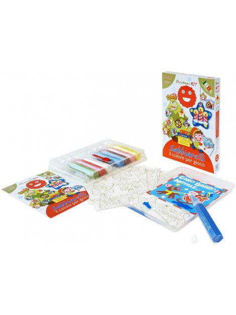 Prodotto: kit Sabbiarelli, ideale per Natale, contiene tutto il necessario per creare e colorare con la sabbia addobbi natalizi