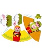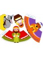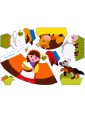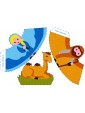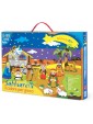 Schede: 9 fogli adesivi (15x20cm) con 10 soggetti 3D, 22 elementi stand up, 1 capanna da colorare con le dita, un set paletta e imbuto per recuperare la sabbia