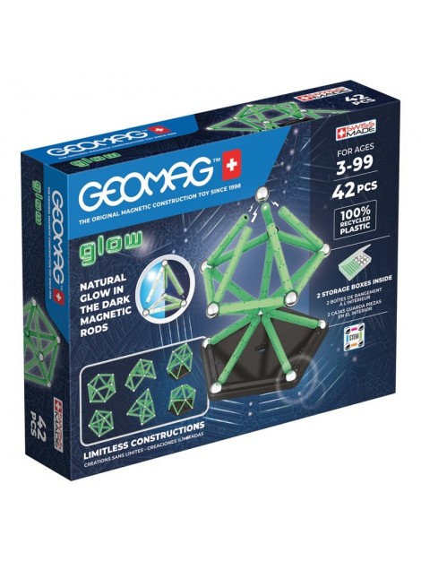 Il glow set 42 pezzi di Geomag è un giocattolo educativo e creativo che offre ore di divertimento ai bambini. Questo set di costruzioni è realizzato con materiali riciclati, contribuendo così alla salvaguardia dell'ambiente.
