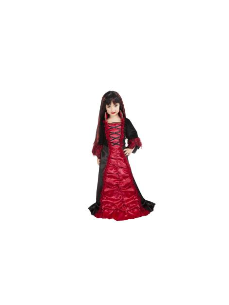 Abito lungo con maniche a sbuffo, realizzato in tessuto rosso e nero, che richiama lo stile delle nobili vampiri.
